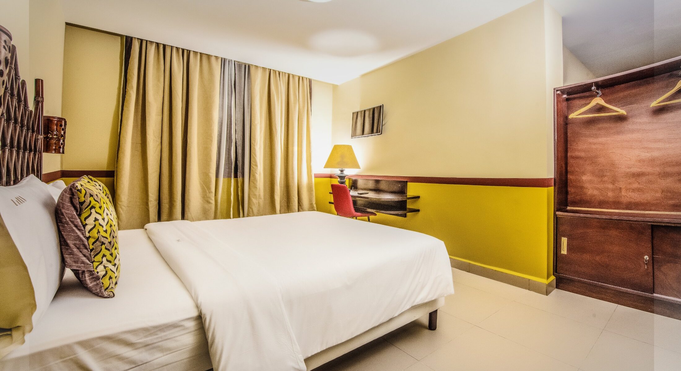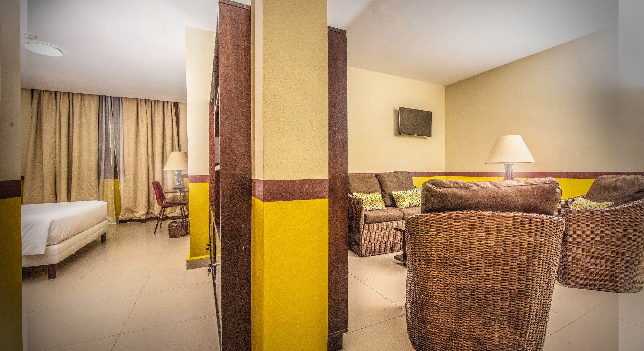 This is a modern, spacious suite with a large bedroom, private bathroom and fully equipped lounge. Its main advantages: Two separate rooms, a complete lounge with local materials, two TV screens, a fridge and an individual safe.